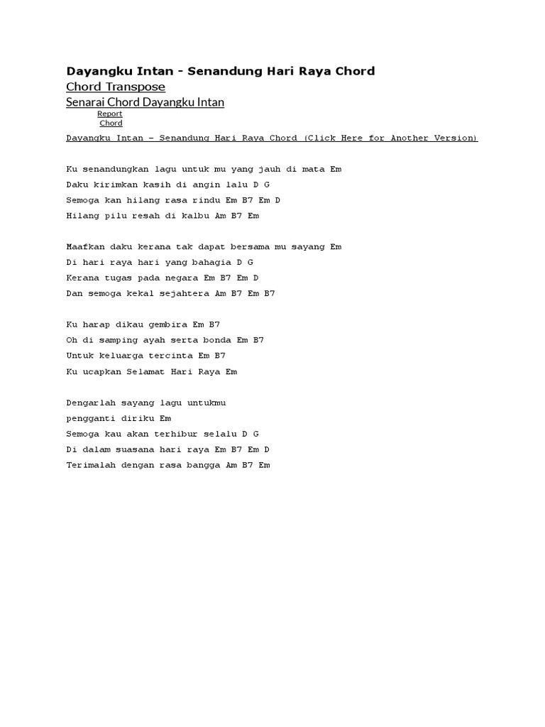 Dayangku Intan Senandung Hari Raya. Dayangku Intan - Senandung Hari Raya Chord Click Here for Another Version Gm F D-D G F D-D-G G Ku senandungkan lagu untuk mu yang jauh di mata F A Daku kirimkan kasih di angin lalu G F Semoga kan hilang rasa rindu C D Gm Hilang pilu resah di kalbu G Maafkan daku kerana tak dapat bersama mu sayang F A Di hari raya hari yang bahagia G F Kerana. Selamat Hari Raya G F G Am Bersalaman-salaman kita semua Bm Dm E5 Selamat Hari Raya Am G F G Am Maaf Zahir Batin kita bersama 2X L.